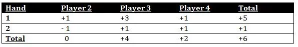 3. O Jogador 3 entrega uma unidade aos Jogadores 1 e 2 por perder para eles, mas recebe uma unidade do Jogador 4 por bater a sua mão (-1 unidade no total).
